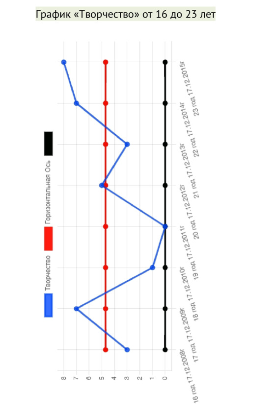 Если график находится ниже оси – предвестник кризиса и застоя, человеку неинтересно реализовываться в данной сфере, у него не получается, вдохновение покидает его. Крайне неблагоприятная зона.