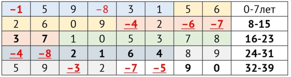 Каждый расчет отвечает за определенный год жизни. Так, первая цифра отвечает за 0 лет, вторая цифра – за 1-й год, третья – за 2-й год, четвертая – за 3-й год жизни и т. д.