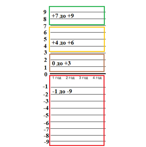 Вертикальная ось бывает положительной и отрицательной. К положительной оси относятся баллы от 0 до +9, а к отрицательной оси относятся баллы от —0,1 до —9.