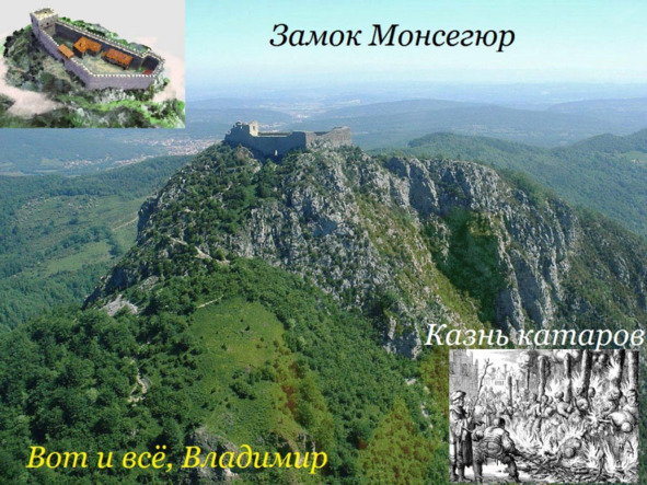 Народ Европы, который не признавал власть церкви над собой, а признавал только лишь власть Всевышнего, должен быть истреблён! Победили, как всегда, подлые, хитрые и коварные люди. И это были не катары. Они были разгромлены, а оставшиеся в живых их войска осаждены в неприступном замке Монсегюр.