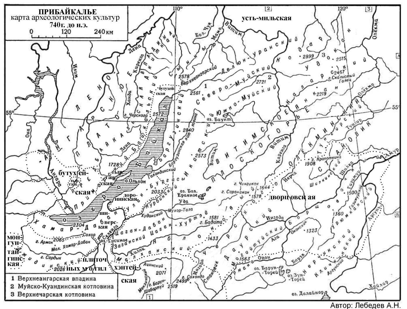 Осмотр начнем с Прибайкалья и обратимся для этого к карте археологических культур Прибайкалья 740 г. до н.э. (Рис. 1).