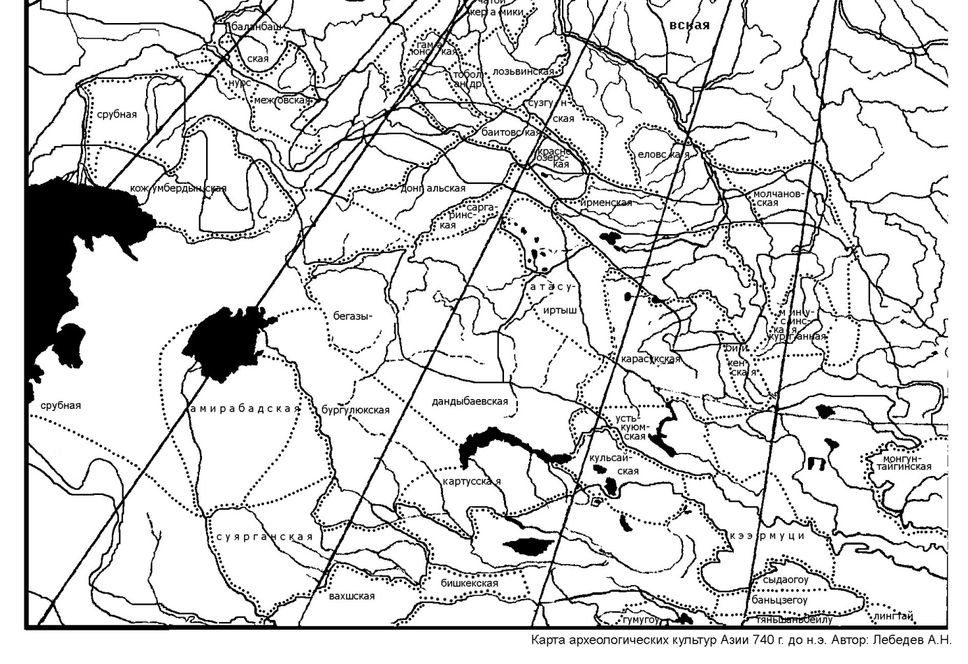 Рис.3. Карта археологических культур Приуралья, Казахстана и Восточного Туркестана 740 г. до н.э.