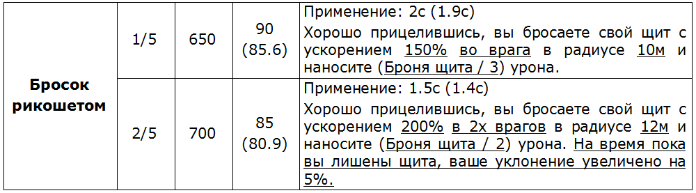Хорошо прицелившись, вы бросаете свой щит с ускорением 150 % во врага в радиусе 10 м и наносите (Броня щита / 3) урона.