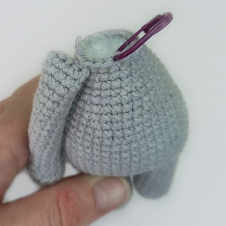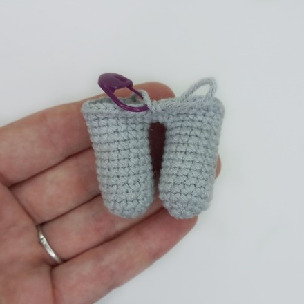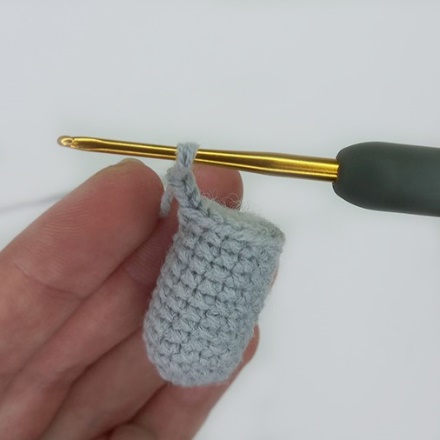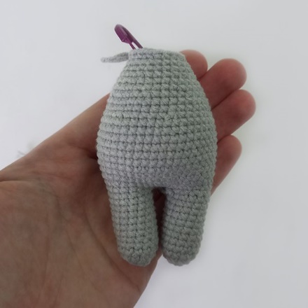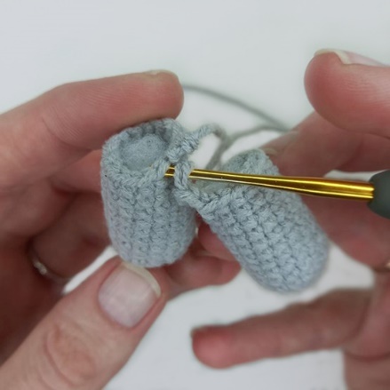Примечание: на одной ноге нить нужно обрезать, оставив небольшой кончик для заправки, а на второй ножке нить не обрезаем. Далее будем продолжать ею вязать, соединив ножки и перейдя к вязанию тела