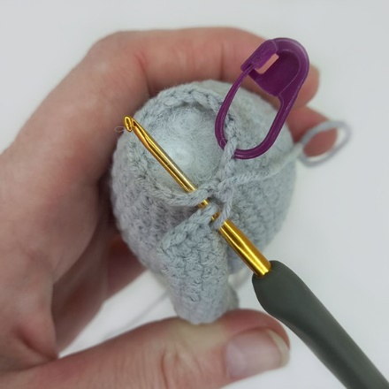 -соединяем вязание со второй ножкой. Для этого вяжем по ножке Б первый СБН при этом крючок вводим в основание столбика, следующего за последним, провязанным в 12 ряду вязания ножки, основанием (фото 4). На этот СБН ставим маркер начала ряда.