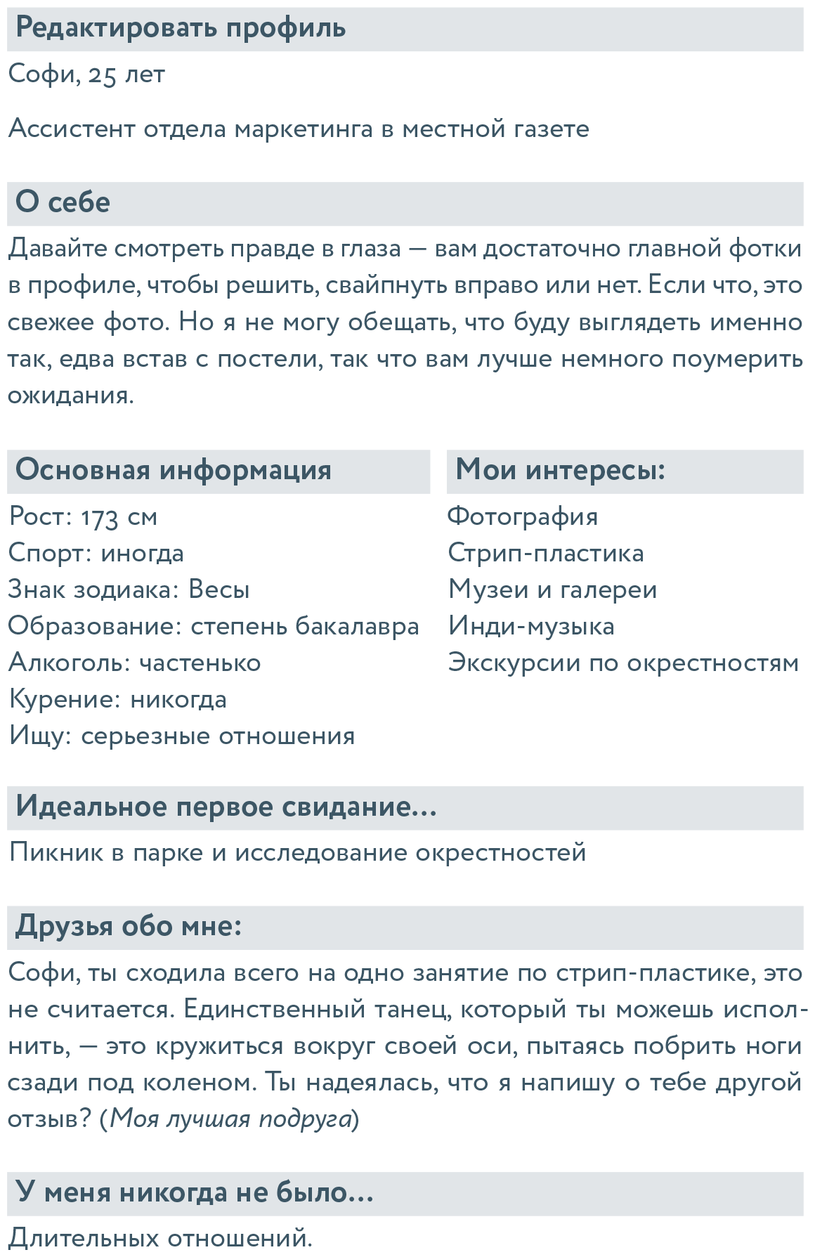 У меня дернулась щека, а губы застыли в натужной улыбке. «Трудный период в личной жизни»? Это моя подруга так сказала или это мать вынесла из их беседы? Сомневаюсь, что Лена именно так и выразилась: по правде говоря, она любит послушать истории о том, какую я творю дичь на свиданиях, а я их с удовольствием рассказываю.
