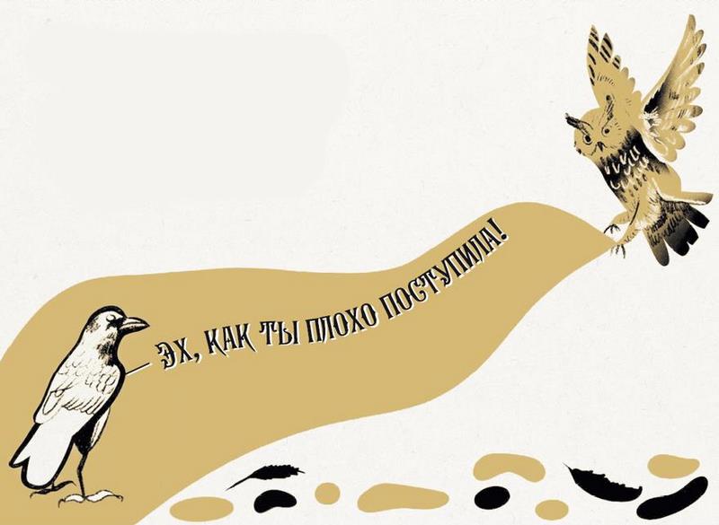 Согласилась сова. Высохли у нее перья, она и говорит ворону: