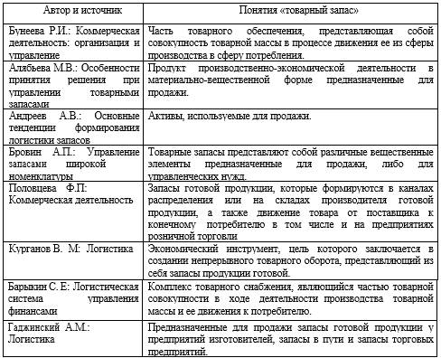 На основе приведенных понятий таблицы 1 можно сделать вывод, что одного общепринятого понятия товарных запасов не существует.