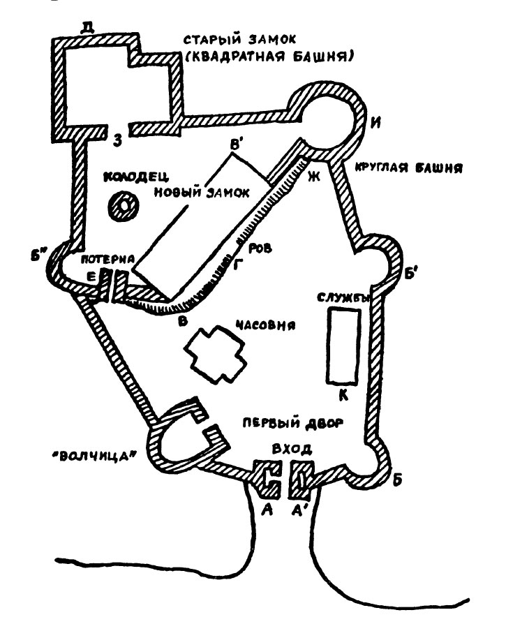 В форт можно было войти через северные ворота, которые охранялись башнями А и А-1, соединенными сводом. Эти башни сильно пострадали во время последних осад генуэзцев, потом были частично восстановлены и приведены в жилой вид тщанием миссис Ранс, которая поселила там прислугу. На первом этаже башни А жили привратники. Из башни А под арку выходила маленькая дверца, позволявшая наблюдать за всеми, кто входит и выходит. Обе створки массивных, окованных железом дубовых ворот давным-давно были распахнуты настежь – ими не пользовались, так как двигать их было довольно трудно, и вход в замок преграждала лишь легкая решетка, которую мог открыть каждый – будь то хозяин или поставщик провизии. Это был единственный вход в замок, который вел в первый двор, образованный крепостными стенами, а также отчасти целыми, отчасти полуразвалившимися башнями. Крепостные стены были далеко не так высоки, как раньше. Древние куртины, когда-то соединявшие башни друг с другом, были снесены и заменены чем-то вроде вала, шедшего по периметру двора; со двора на вал вели довольно пологие пандусы. Вдоль всего вала еще сохранился парапет с бойницами для легких орудий. Эта переделка была выполнена в XV веке, когда владельцам замков уже приходилось серьезно считаться с артиллерией. Башни Б, Б-1 и Б-2 долгое время сохранялись в первоначальном виде, но потом их островерхие крыши заменили плоскими платформами, на которые поставили пушки; позже их сравняли по высоте с парапетом вала, в результате чего из них получилось нечто вроде демилюнов[11]. В XVII веке башни сделали ниже, чтобы они не заслоняли вид из окон другого построенного тогда же замка, называемого Новым, хотя он теперь и заброшен. Новый замок помечен на плане буквами В-В-1.