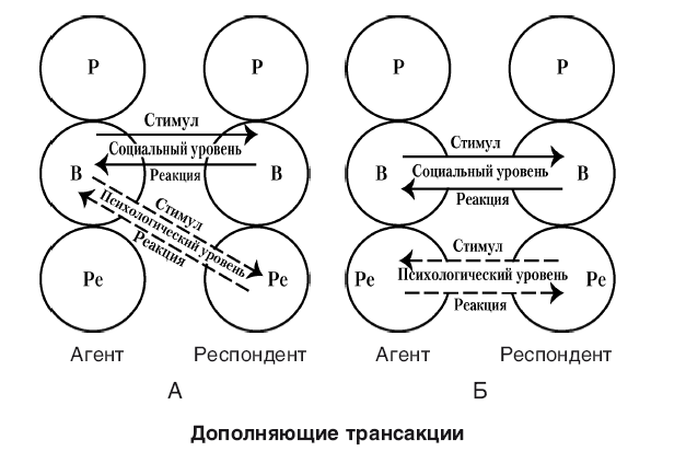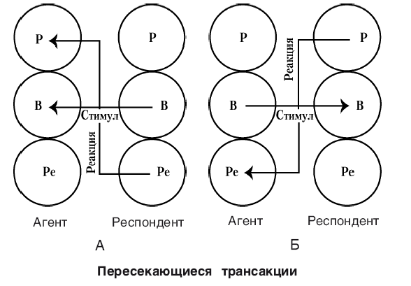 Обе эти трансакции являются дополняющими, то есть реакция на стимул правильная, ожидаемая и вытекает из нормальных человеческих взаимоотношений. Первая трансакция (которая классифицируется как дополняющая трансакция типа 1) представлена на рис. 2А. Вторая (дополняющая трансакция типа 2) – показана на рис. 2Б. Очевидно, однако, что трансакции связываются в цепочки таким образом, что каждая реакция, в свою очередь, становится стимулом. Первое правило коммуникации таково: коммуникация будет осуществляться беспрепятственно, пока трансакции остаются дополняющими; следствие этого правила: пока трансакции остаются дополняющими, коммуникация в принципе может продолжаться неограниченно долго. Это правило не зависит от природы или содержания трансакций; оно основано исключительно на направлении действий. Пока трансакции остаются дополняющими, неважно, о чем говорят двое людей: ворчат по-стариковски (Родитель – Родитель), решают проблему (Взрослый – Взрослый) или играют друг с другом (Ребенок – Ребенок или Родитель – Ребенок).