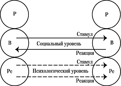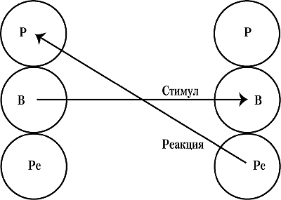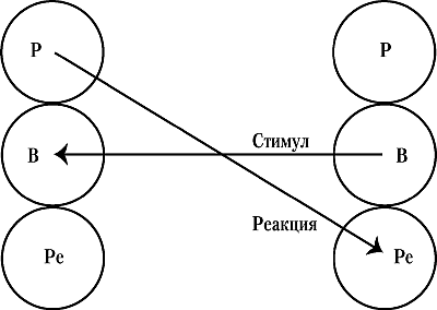 На рисунках 3А и 3Б другая ситуация. На рис. 3А стимул Взрослый – Взрослый (ВВ) – например, просьба о дополнительных сведениях – вызывает реакцию Ребенок – Родитель (РеР), так что стрелы, обозначающие стимул и реакцию, не параллельны, а пересекаются. Трансакции такого типа называются пересекающимися, и в таком случае коммуникация нарушается. Если, например, муж спрашивает: «Где мои запонки?», а жена отвечает: «Почему ты всегда во всем винишь меня?», имела место пересекающаяся трансакция, и больше говорить о запонках они не могут. Это пересекающаяся трансакция первого типа, которая представляет обычную реакцию переноса, часто встречающуюся в психиатрической практике. Именно такие трансакции причиняют в жизни наибольшие неприятности. На рис. 3Б представлена пересекающаяся трансакция второго типа, в которой стимул Взрослый к Взрослому (ВВ), например вопрос, вызывает покровительственную или напыщенную реакцию Взрослого к Ребенку (ВРе). Это обычная реакция контрпереноса, и пересекающиеся трансакции второго типа служат наиболее частой причиной трудностей в личных и политических взаимоотношениях.