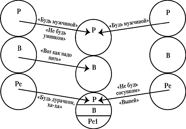 Сценарные предписания Батча показаны на рис. 6. Вверху раздраженный Родитель отца говорит: «Будь мужчиной, не будь умником», в то время как снизу выглядывает Ребенок отца и говорит: «Будь дурачком, ха-ха». Вверху слепо любящий Родитель матери говорит: «Будь мужчиной, но ты еще слишком молод для этого», в то время как внизу ее Ребенок поддразнивает: «Не будь сосунком, выпей». А посредине Взрослый отца с помощью дядюшки показывает ему, как нужно пить.