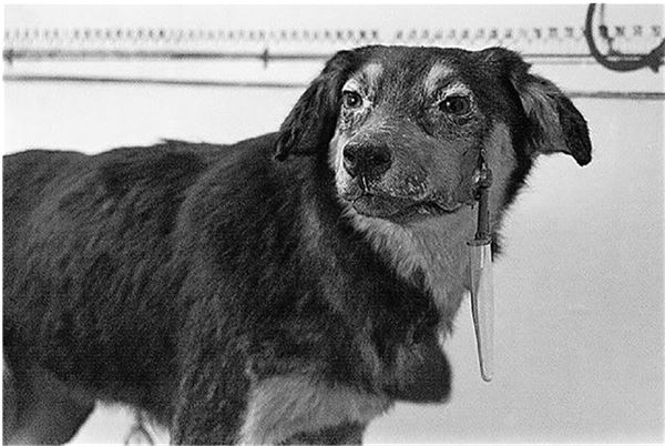 Одна из собак Павлова изображена с трубкой для сбора слюны, которая позволяет отследить, насколько ее реакция слюноотделения может быть изменена (обусловлена) звуком колокольчика.