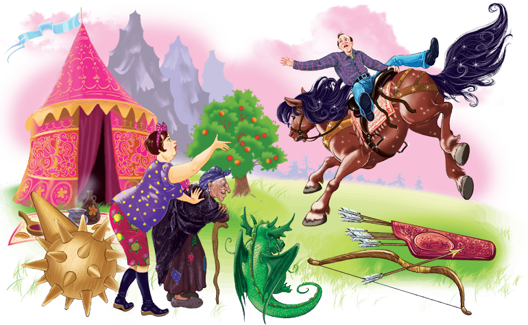 – Не хочешь к утюгам да к плите возвращаться? Держись, идем на посадку! – Баба-Яга обернулась к Авдохиной и, схватившись за метлу, служившую ступе рулем, увела ступу в крутой вираж. Приземлились они посреди поля у большого шатра. Рядом пощипывал траву оседланный богатырский конь. К седлу было приторочено длинное копье и лук с колчаном, полным стрел. Поодаль лежала богатырская палица. От собственной тяжести она вросла в землю, и Пирожков, дернув несколько раз за ее ручку, отошел в сторону, очень сконфуженный.