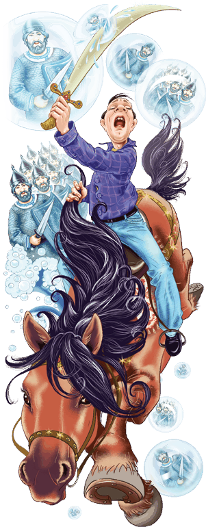 Неуверенно бормоча, что он человек невоенный и подагрический, Пирожков вышел из шатра и, поставив ногу на камень, кое-как взгромоздился в седло. Застоявшийся Саврасый нетерпеливо грыз удила. Богатырский конь рвался в бой и удивленно оглядывался на понуро сидящего на нем Пирожкова, делавшего героические попытки не свалиться.