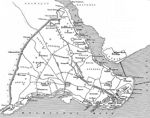 Расстояние от Стамбула (Царьграда) при плаванье через море до Севастополя (Херсонес) 535 км., до Керчи (Боспор) 810 км. При каботажном плаванье от Стамбула до Констанцы (Томы, столица Малой Скифии) 503 км., до Белгорода 820 км., до Одессы 865 км., до Фессалоник 635 км.