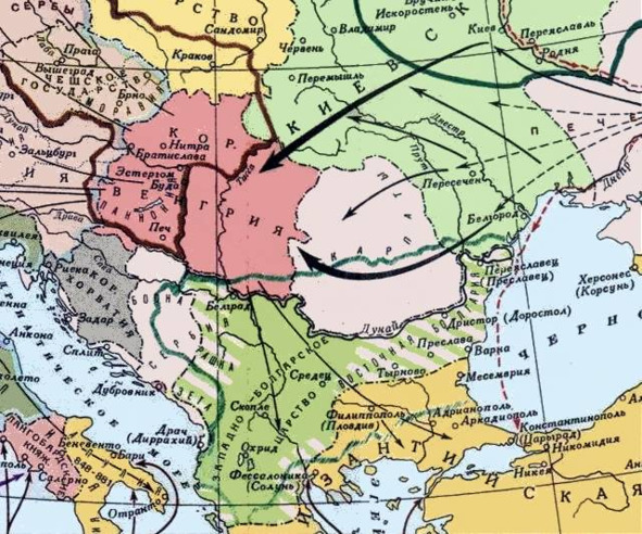 Размещение Киевской Руси в Подунавье до эпохи Орды, не так уж нелепо. Дело в том, что с 10 века и до создания Венгерской Валахии в 1368 г., эти территории занимающие треть главной европейской транспортной артерии – реки Дунай, в европейской и российской историографии вообще никак не обозначены. Иногда на них, чтобы заполнить место, обозначаются кочевые племена. У такого важного региона нет истории 6—13 веков. А после, в 14 веке появляются румынские княжества с литовскими и славянскими названиями. Большинство гидронимов и топонимов региона имеет восточнославянское происхождение. А сам румынский язык до конца 19 века базировался на кириллической графике и заимствованиях из русского языка. В дальнейшем он был офранцужен.
