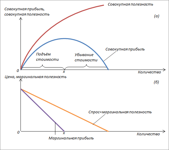 Подъём стоимости происходит на отрезке, где общая полезность и общая прибыль возрастают, а маргинальная прибыль положительная. Снижение стоимости происходит на отрезке, где общая полезность всё ещё возрастает, но общая прибыль и маргинальная прибыль отрицательны.