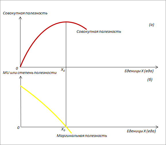 Общая полезность постепенно возрастает до Х0 количества единиц еды, но маргинальная полезность постепенно убывает по мере того, как добавляются дополнитеьные единицы еды.