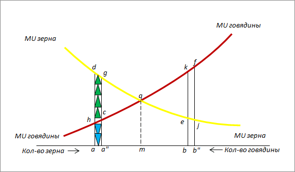 Рассмотрим торговый огран А и предположим, что он имеет в наличии количество зерна а'. Увеличение запаса зерна А, представленное небольшим отрезком а'а, одновременно представляет уменьшение запасов говядины А. Но важный пункт состоит в том, что А выигрывает, обменивая зерно на говядину. Почему? Потому что он получил бы большую полезность, приобретая зерно, чем потерял бы, отказавшись от приобретения говядины. В частности, обращаясь к Рис. 14–2, выигрыш А составлял бы область a'hca, где чистая прибыль является областью hdgc