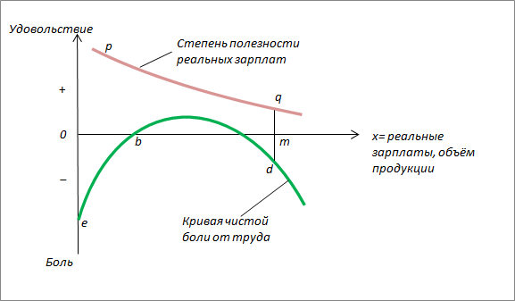 При анализе принятия решений о выполнении работы, Джевонс концентрировался на трёх количествах: чистая боль от работы, объём продукции и объём извлечённой полезности. Графически, комбинацию из этих трёх количеств можно проанализировать так, как это сделано на Рис. 14–3. В системе сдельного труда реальная заработная плата и доход рабочего зависят от его или её показателя производительности. Кривую pq можно рассматривать как степень полезности, взвешенную благодаря производительности рабочего или выпуска им готовой продукции. Вознаграждение за труд, другими словами, можно рассматривать как продукт показателя производительности и степени полезности. Издержки рабочей силы представлены кривой, прочерченной ed. Здесь Джевонс предположил, что акт начала работы тягостный и причиняющий чистую боль. Но, по мере того, как работа продолжается, она становится всё более приятной до тех пор, пока не будет достигнуто определённое равновесие, а затем достигается такая точка, в которой болезненность начинает преобладать над удовольствием от работы. Итак, кривая чистой-боли-от-работы поднимается вверх, а затем обращается вниз, становясь отрицательной.