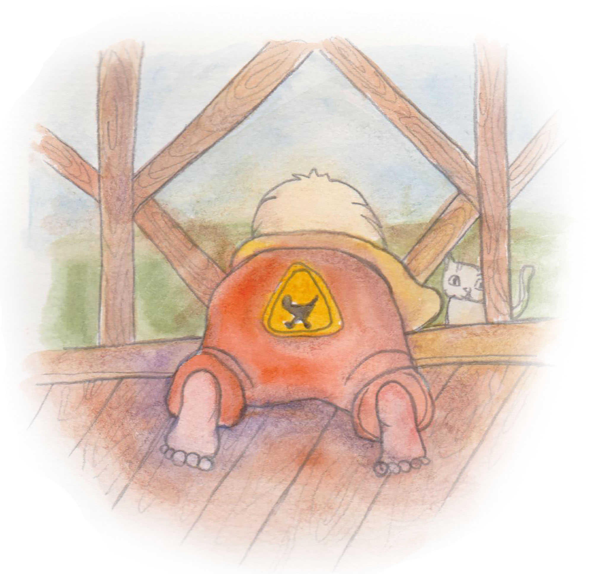 На лужайке перед домом есть совсем маленький пруд, и на его берегу на тёплых камнях очень любит загорать ленивая лягушка. А с другой стороны пруда за храбрым лягушонком всегда наблюдает серый дракон.