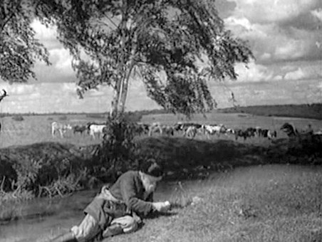 Завершается фильм Сергея Герасимова «маленьким бегством» героя из праздничной действительности – в замыкающую пейзажную рамку. Подчеркнуто «по-пацански» удрав из дома через окно, хотя ничто не мешало ему просто выйти в дверь, он выходит за околицу, на ночной простор с луной и неизменным сочетанием березы, дороги и колхозного поля, и, экстатически закинув руки за голову, произносит: «Жизнь! Любимая моя жизнь!» Идиллия, замкнувшись в экранной экфрасе, размыкается в ту «большую жизнь», частью которой является зритель.