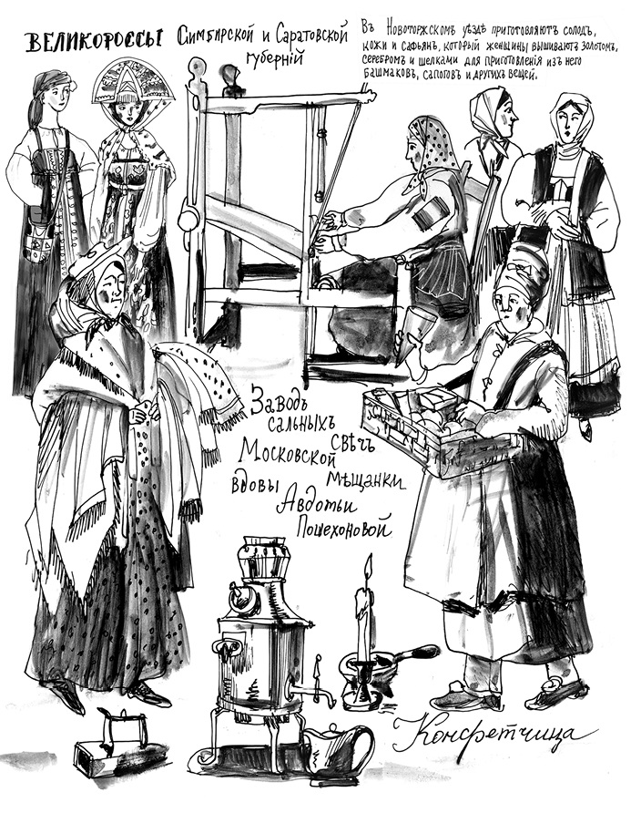 По Москве довольно подробную картину присутствия мещанок в мелкой промышленности и ремесле можно получить по архивным документам. В 1811 году в московском мещанстве числились 18 138 человек (6,6 % городского населения), в 1825 году мещане составляли 33 417 человек (13 %), в 1840‐м – 55 375 (16 %). Доля мещанок среди владелиц заведений в мелкой промышленности (число рабочих до 16 человек) составляла в разные годы до 25–30 %. Им принадлежали скромные по размерам предприятия, выпускавшие продукцию массового спроса: платки и ленты, ткани шерстяные и хлопчатобумажные в небольшом объеме, чулки и рукавицы, готовое платье, помаду и румяна, сальные свечи для освещения жилищ. Во владении мещанок находилось несколько десятков кузниц (около 20–30 % из общего числа 150 в 1847 году). В 1847 году в домашнем пользовании москвичей было 46 810 лошадей при числе жителей 349 987 человек, поэтому кузницы, где делали подковы и части упряжи, были важнейшим элементом городской инфраструктуры.