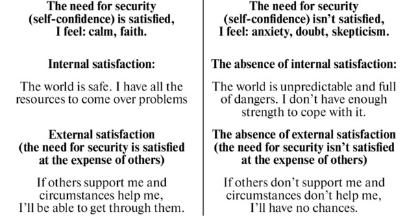 In this case, the need for security will be satisfied by internal resources, a person trusts his feelings and thoughts, fearlessly makes his own decisions regarding his life. This attitude helps to feel calm, confident in a situation of uncertainty. Otherwise, there is a pattern “The world is unpredictable and full of dangers. I don’t have enough strength to cope with it”, it forces a person to seek security at the expense of external resources “If others support me and circumstances will help me, then I can get through them”, then all his decisions are determined by the situation, but he does not rely on his own feelings and thoughts, but on the opinion of significant people who still questioned. 1. The world is safe. I have all the resources to come over problems.