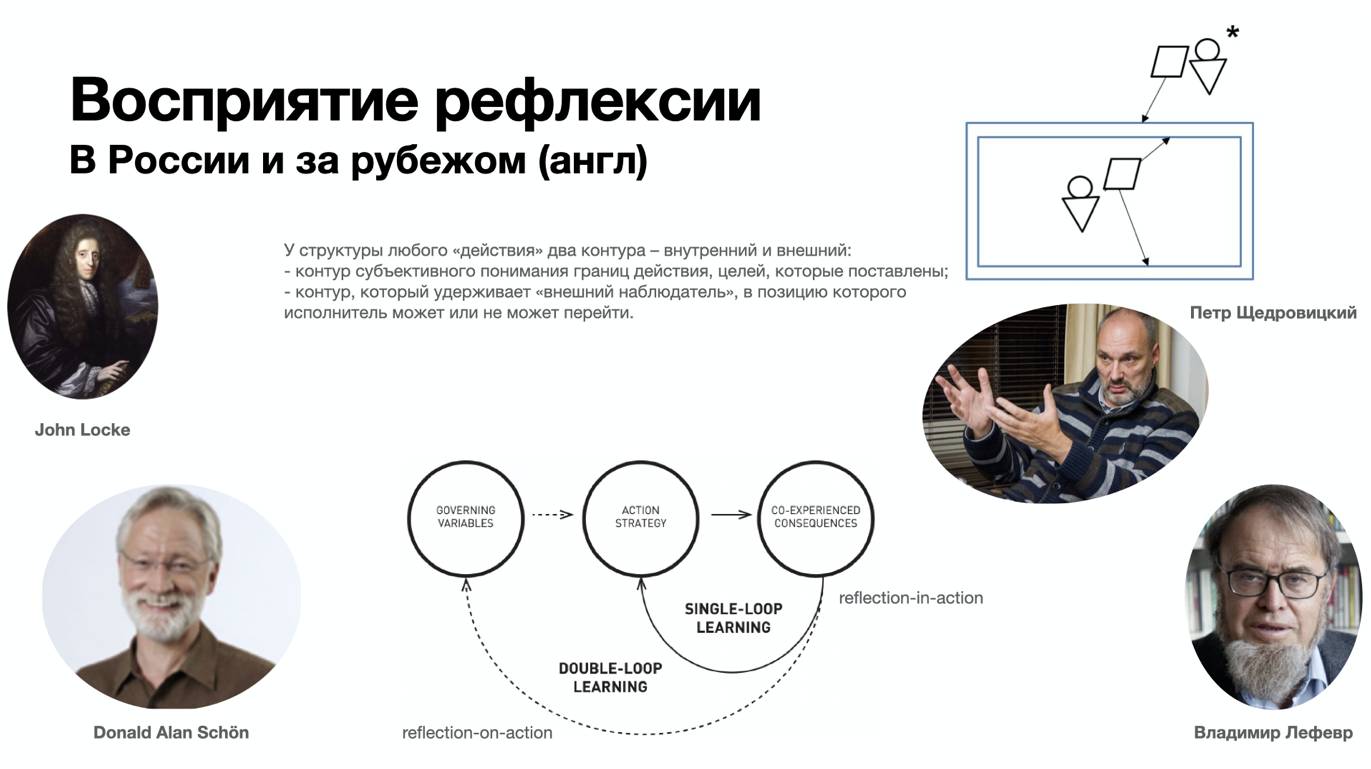На западе примерно так же обсуждают два уровня модели Шона «рефлексия в действии/ рефлексия над действием». В частности, одно исследование учителей выявило акцент внимания молодых учителей на уровень «в действии» – их волновала собственная успешность в традиционных форматах деятельности. Опытные учителя больше концентрировались на уровне «над действием» – их волновало, насколько сама деятельность, в которой они участвовали, отвечает задачам этой деятельности.