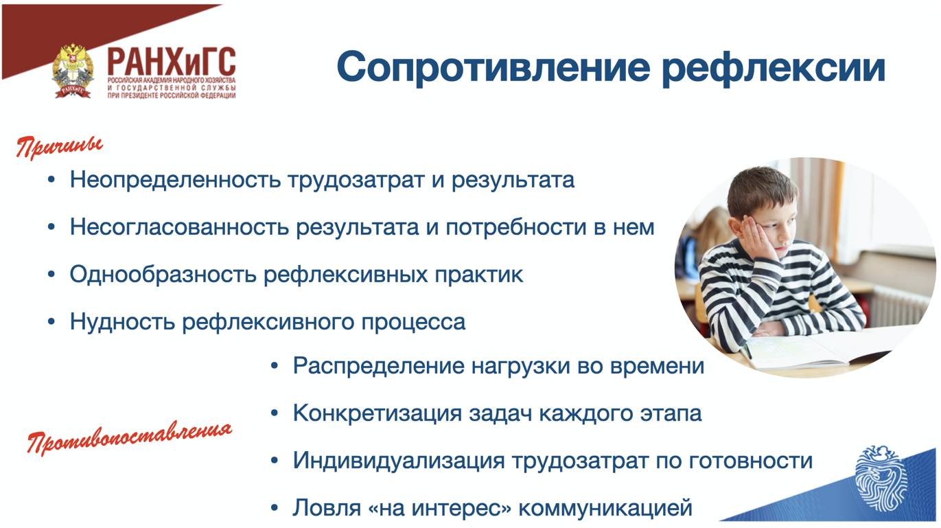 Чтобы повысить эффективность и продуктивность познания, рефлексия должна стать регулярным и управляемым инструментом в руках учителя. А для этого учитель в роли модератора/фасилитатора должен найти такую модель проведения, чтобы она доказала полезность и не вызывала сопротивления. Поскольку современные практики эту задачу не решают, надо строить новые. Смысл нашей работы по итогам обзора заключался в поиске подходов по преодолению сопротивления.