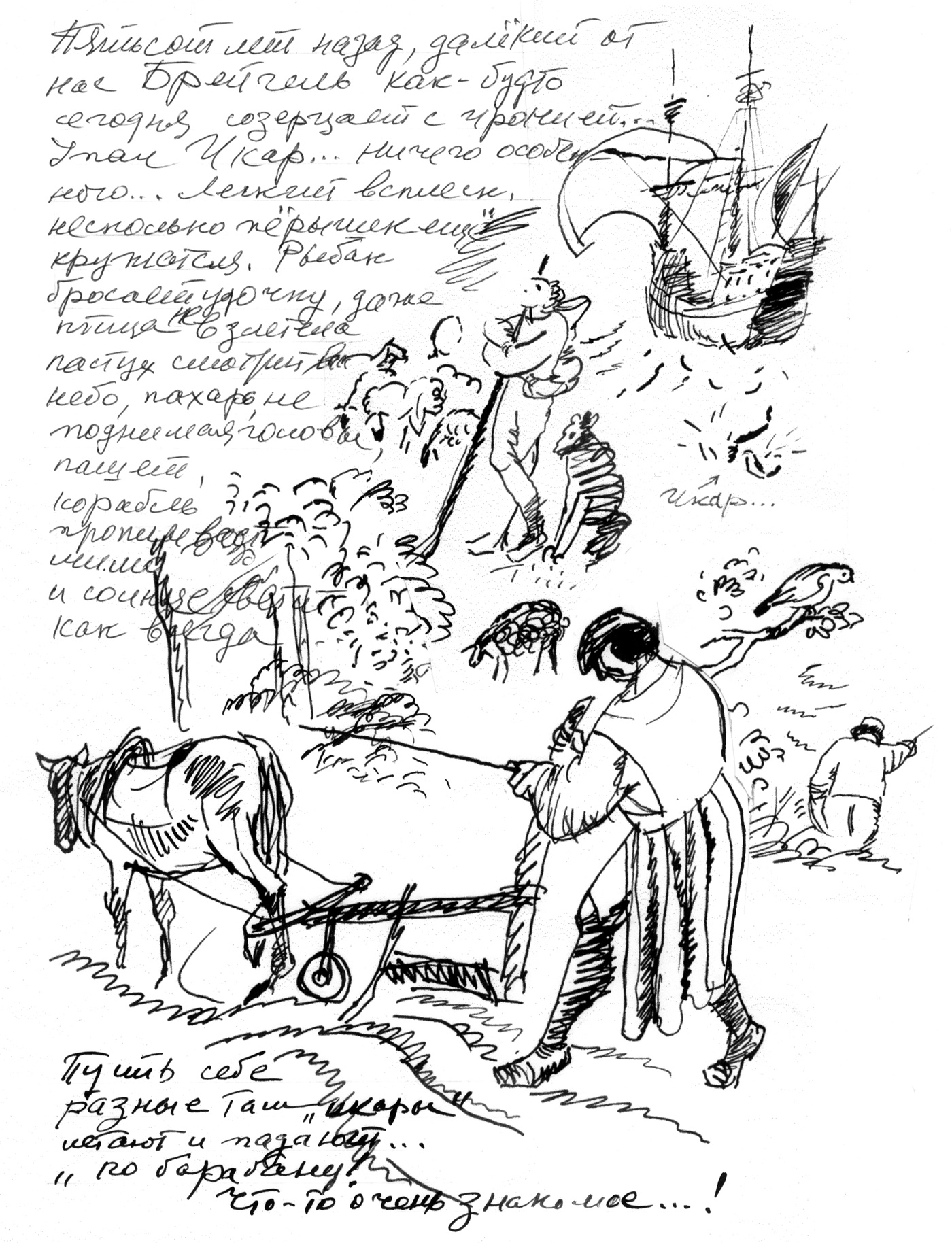 То же самое – первобытное искусство, откуда всё начиналось. У него более низкий уровень исполнительского мастерства, но оно не менее эмоционально. Эмоциональность во всем – в движении, в рассказе. Таково первое условие, без него любой сюжет, который только мог придти в голову человеку того времени не имел значения. Если он не был эмоциональным. Ради чего-то другого не было смысла рисовать. И художники того времени нигде не отступают от этой задачи, от ее решения. Они постоянно повторяют одно и тоже. И это их не огорчает, это им не скучно. Потому что они так общаются, они разговаривают, они учатся говорить. Рисование – это по сути дела письменность. Только видоизмененная. Потом этот рисунок превращался во что-то другое. Но что было раньше? Сначала было рисование, а уже потом буквы. Сам предмет изображения, это сначала рисунок, а потом условный знак. Фиксация условных обозначений. Пиктография. И насколько он совершенствуется, настолько возникает алфавит. Но сначала был рисунок. Люди так разговаривали, они писали друг другу, или все вместе, или кто-то один всем остальным. Они писали с помощью рисования, и это было понятнее, чем все остальное. Потому что в одном племени гугукали, а в другом мэкали. Изображение открывало им доступ к общению, к обмену первобытной информацией. Куда идти, где повернуть, где, какие звери. Где они есть, где нет. И где стойбище третьего племени, на которое нужно напасть. Это все можно изобразить. И это изображалось. Задолго до всякой азбуки. Можно представить, как они чертили палками на песке, рисовали, перебивая друг друга. Или на стене. Это была жизнь! Азартная. Слов не хватало, переводчиков не было. А изображение было. Ветер поднимался, когда они принимались махать руками. И чертили палками по песку, по глине, на берегу… То, что сохранилось на стенах пещер, – кошкины слезы. Потому что основное рисовалось на земле. Пригладил ладонью и тут же изобразил. Уровень наскального письма отличался тем, что там воспроизводились наиболее совершенные формы. Как у нас. Если ты не художник, то можешь рисовать и рисовать. Как дети рисуют. А потом из этого кристаллизуется некий профессионализм. На более совершенном материале. Появляется претензия на то, чтобы этому изображению задержаться. Стирать уже не хочется, хочется оставить, а потом уже сознательно воспроизвести.