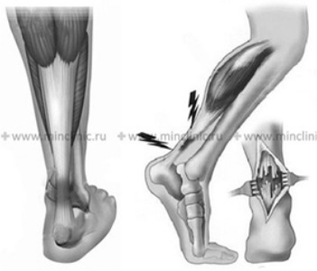Разрыв ахиллова сухожилия обычно бывает полным. Чаще разрывы происходят при внезапной резкой нагрузке на сухожилие при старте у спринтеров, в момент отрыва ноги от земли при прыжке, при резком тыльном сгибании стопы – падение с высоты. При прямой травме режущим предметом может возникнуть частичное повреждение сухожилия. Пациент жалуется на боли в области ахиллова сухожилия. В момент травмы возникает ощущение удара по сухожилию. На задней поверхности нижней трети голени возникает кровоизлияние, отек. В области разрыва обнаруживается западение. Подошвенное сгибание стопы отсутствует – пациент не может встать «на носочки». При оказании первой помощи пострадавшему надо дать обезболивающее и доставить в больницу.