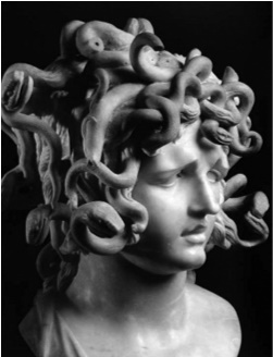 Горго́на Меду́за (греч. Μέδουσα, точнее Медуса – «стражник, защитница, повелительница») – наиболее известная из сестёр горгон, чудовище с женским лицом и змеями вместо волос. Её взгляд обращал человека в камень. Была убита Персеем. Упомянута в «Одиссее» (XI 634). Написание: «горгона Медуза», где «горгона» – вид чудовища, а «Медуза» – имя собственное. Своё имя морская медуза получила из-за сходства с шевелящимися волосами-змеями легендарной горгоны Медузы из греческой мифологии. Caput Medusae (голова Медузы) – так называется расширение подкожных вен передней брюшной стенки со змеевидным ветвлением вокруг пупка, наблюдаемое при портальной гипертензии. У мифического чудовища Медузы на голове вместо волос росли извивающиеся змеи, что и вдохновило ренессансного медика Северина Боеция на создание термина (1643 г.).
