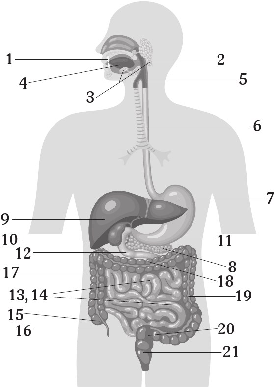 4 – полость рта, 5 – глотка, 6 – пищевод, 7 – желудок, 8 – поджелудочная железа, 9 – печень,