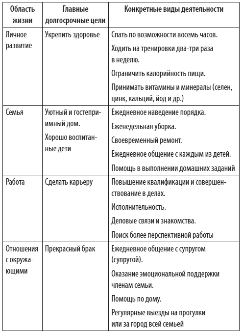 Возьмите каждую из ваших долгосрочных целей и составьте список видов деятельности, которые на протяжении года-двух смогут привести к ее достижению. Сделайте его как можно более подробным. Вот пример того, как может выглядеть ваш список.
