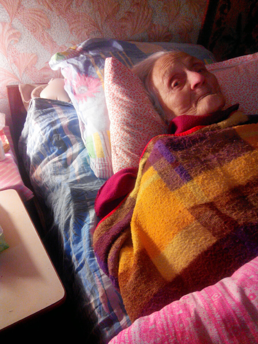 Я залезла на кровать, взяла бабушку под руки и слегка приподняла. Очень быстро у неё закружилась голова и я снова уложила её на подушку. Минут через 15 мы снова попытались…и снова…и снова…