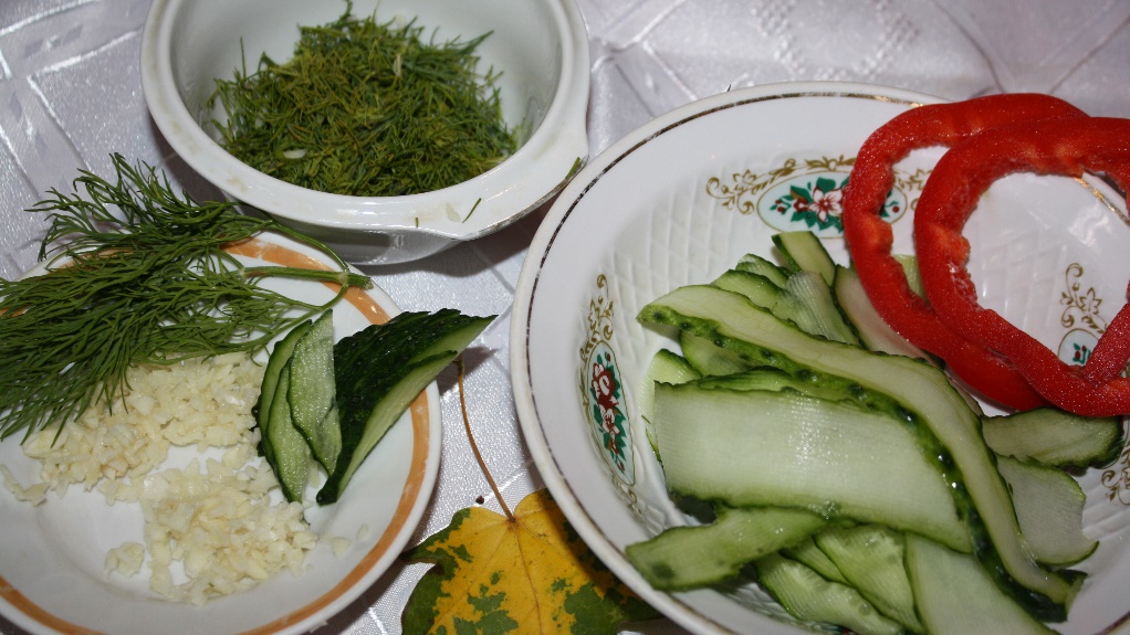 200 гр молодых огурцов, около 50 гр творожного сыра, 1 зубчик чеснока, несколько веточек зеленого укропа, кольцо красного сладкого перца.