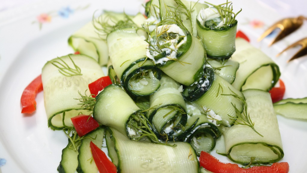 Каждую пластинку огурца смазать сыром, посыпать чесноком, укропом и свернуть рулетом.