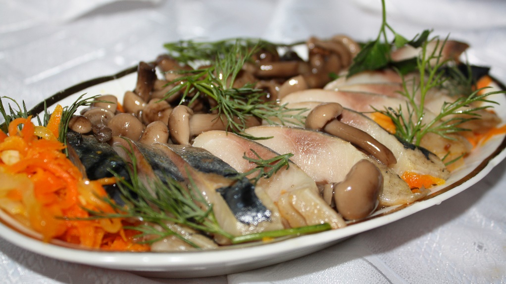 120 гр филе без кожи соленой или копченой скумбрии, 60 гр репчатого лука, 2 зубчика чеснока, 150 гр моркови, около 50 гр маринованных лесных грибов (опята), 2 столовые ложки растительного масла, по 2-3 веточки зелени укропа и петрушки, перец по вкусу.
