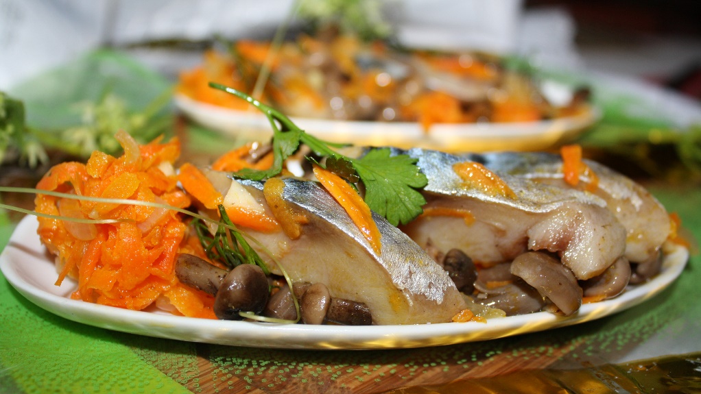 В тарелку для подачи рыбы первым слоем выложить обжаренные овощи, на них – кусочки скумбрии и грибы. Оформить закуску пряной зеленью и подать на стол.