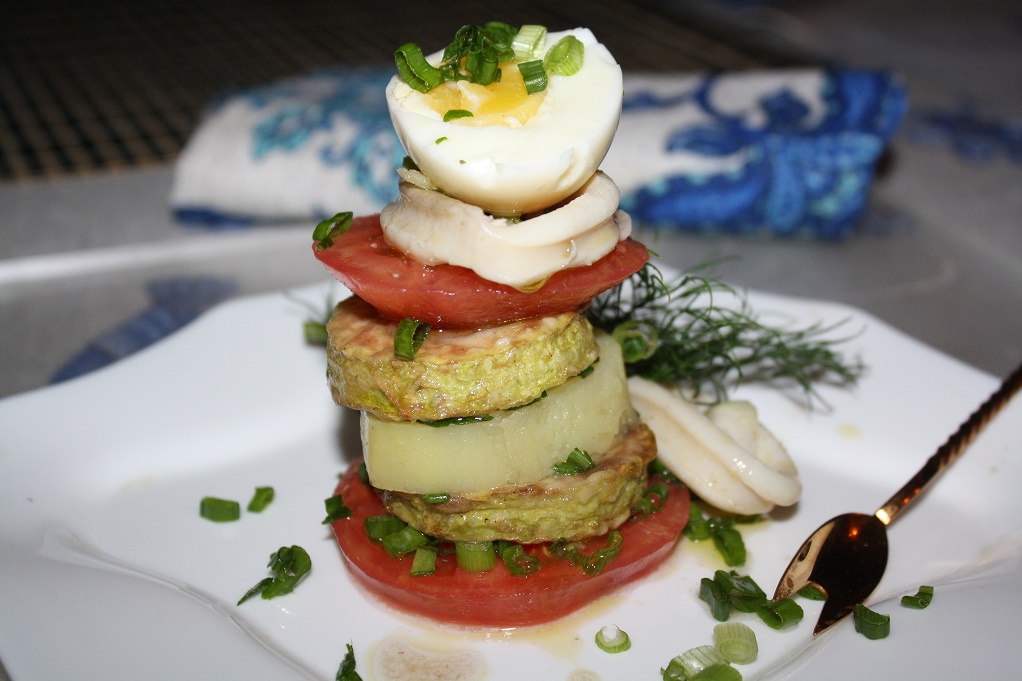 Кожу помидора надрезать в верхней части плода, на 1 минуту опустить в кипящую воду, затем остудить в холодной воде, очистить от кожи. Нарезать кружками. Зеленый лук нарезать. Очистить кальмара от кожи и внутренностей, нарезать кольцами, варить в подсоленной воде 5-7 минут, отцедить. Смешать оливковое масло, маринад, сахар и соль, взбить вилкой в эмульсию, залить кольца кальмара, оставить на 2-3 часа. Молодой кабачок нарезать кольцами, запанировать в подсоленной муке, жарить в кипящем растительном масле с двух сторон по 2-3 минуты. Яйцо опустить в воду, довести до кипения, варить при бурном кипении 3 минуты, остудить в холодной воде, очистить, разрезать вдоль пополам.