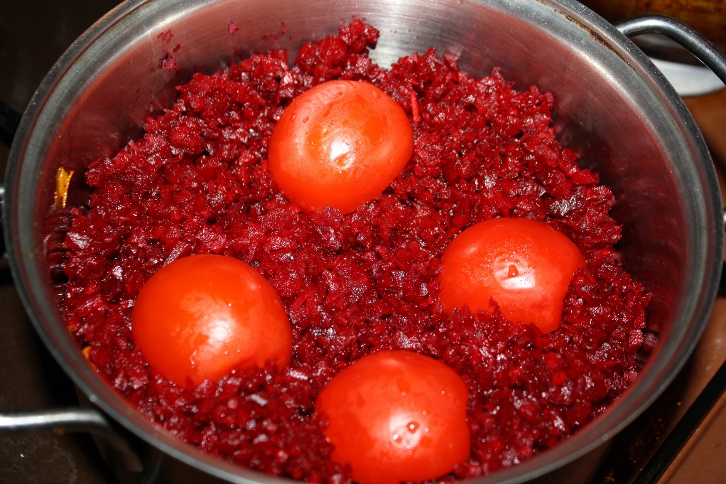 Овощи очистить. Свеклу нарезать кусочками, взбить в кухонной машине в крошку или пропустить через мясорубку. Морковь натереть на овощной терке. Лук нарезать тонкой соломкой. Чеснок мелко нарубить. Перец чили нарезать мелкими кусочками. Помидоры разрезать вдоль пополам, вырезать плодоножку.