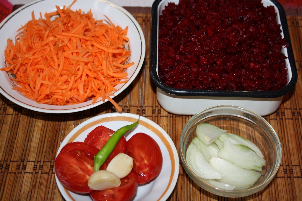 600 гр свеклы, 150 гр моркови, 100 гр лука, 100 гр помидоров, 2 зубчика чеснока, маленький перчик чили, 1 чайная ложка яблочного или ягодного уксуса, около 50 гр растительного масла, около 50 мл воды, соль по вкусу, 0,5 чайной ложки молотого имбиря.