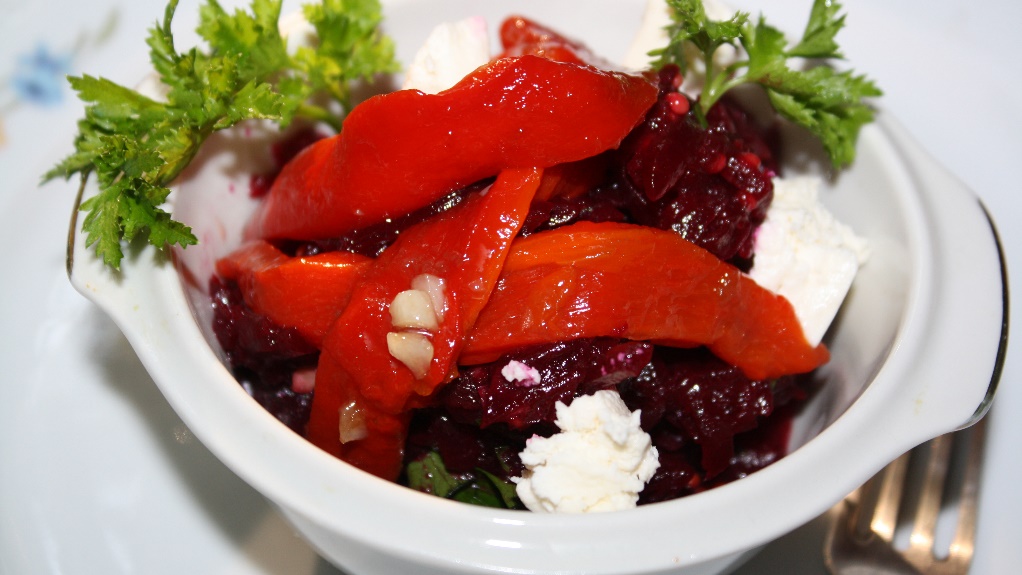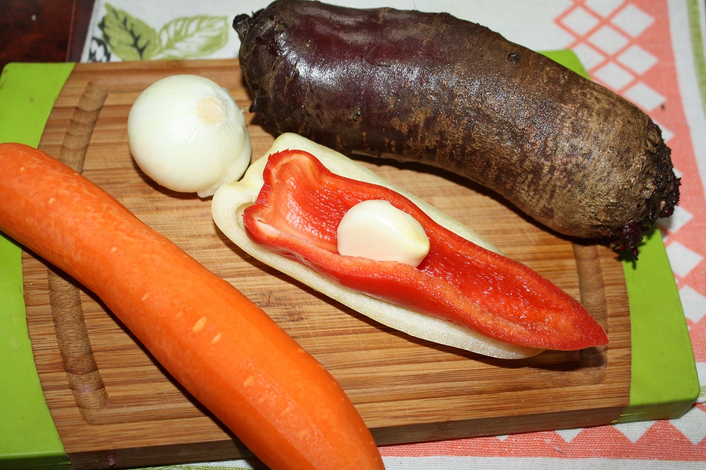 Около 500 гр свеклы, по 50 гр репчатого лука и сладкого перца, 1 крупный зубчик чеснока, около 100 гр моркови, 3 столовые ложки рассола от маринованных овощей, 2 столовые ложки свекольного кваса (можно заменить 1 столовой ложкой яблочного уксуса), 1 столовая ложка куриного бульона фюме, около 50 мл растительного масла, кусочек (3 см) острого перца, пряности по вкусу (например, сушеные травы розмарин и майоран, молоты тмин и горчица), соль по вкусу (можно без соли)