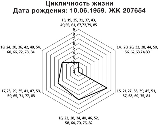 Например, в тринадцать лет женщина находилась под влиянием вибрации цифры «2». В следующем цикле двойка будет воздействовать через шесть лет, так как у нее цикл шестилетний. То есть она попадает на возраст девятнадцать лет и так далее (см. схему ниже). Каждой цифре кода соответствует определенный год жизни.