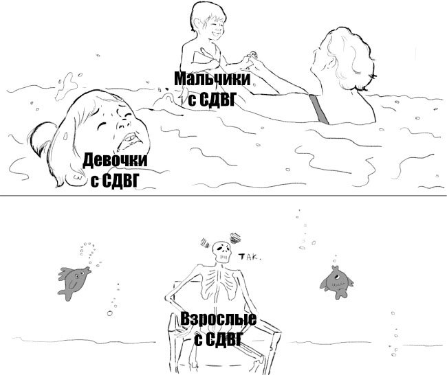 Во-первых, у девочек симптомы невнимательности чаще превалируют над гиперактивностью, а во-вторых, к девочкам всегда предъявлялись другие требования. Так и вышло, что мечтательные, легко отвлекающиеся и рассеянные девочки скорее были объектами милых (или не очень) насмешек от родственников, учителей и товарищей по играм, однако сильно никому не мешали. Это рассматривалось как некий шарм или «женский склад ума». Именно поэтому долгое время бытовало мнение, что СДВГ бывает только у мальчиков.