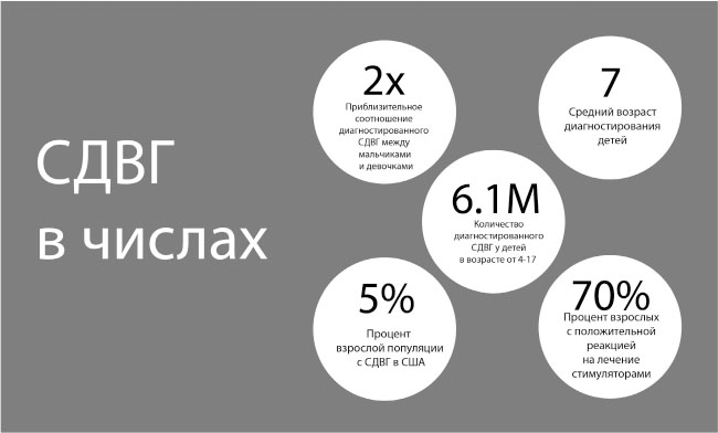 По данным метаанализа 2007 года[1], СДВГ диагностируется примерно у 5–10 % детей и подростков, а также у 2,5–5 % взрослого населения по всему миру. Про распространенность в России сказать сложно, так как переход на международную классификацию болезней 11 пересмотра (МКБ-11[2]) в 2024 году только завершится, и диагноз, описывающий похожую симптоматику, будет отображен не только в детском разделе. А пока статистика у взрослых не собирается, и остается полагаться только на мировой опыт.