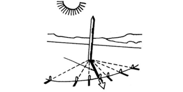 Незадолго до наступления предполагаемого полудня отметьте колышком положение конца тени и делайте отметки до тех пор, пока она снова не начнет удлиняться.