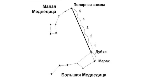 В Северном полушарии направление на север можно определить с помощью Полярной звезды, расположенной примерно над Северным полюсом. Для этого найдите на небе созвездие Большой Медведицы с характерным расположением звезд в виде ковша с ручкой. Через крайние две звезды ковша проведите воображаемую прямую линию. Расстояние между этими звездами отложите на линии пять раз. На конце пятого отрезка будет находиться яркая звезда – Полярная. Направление на нее будет соответствовать направлению на север (рис. 3).